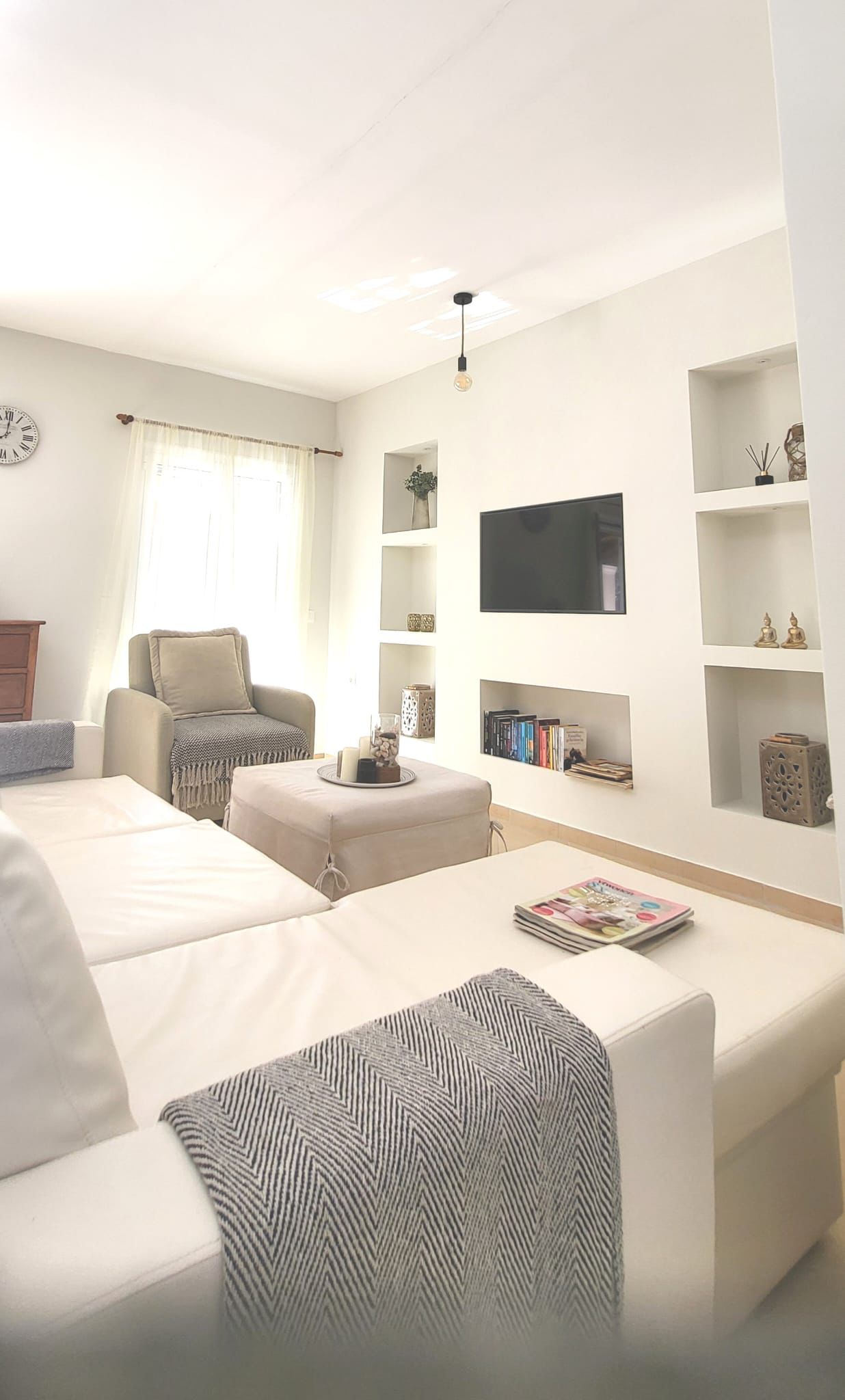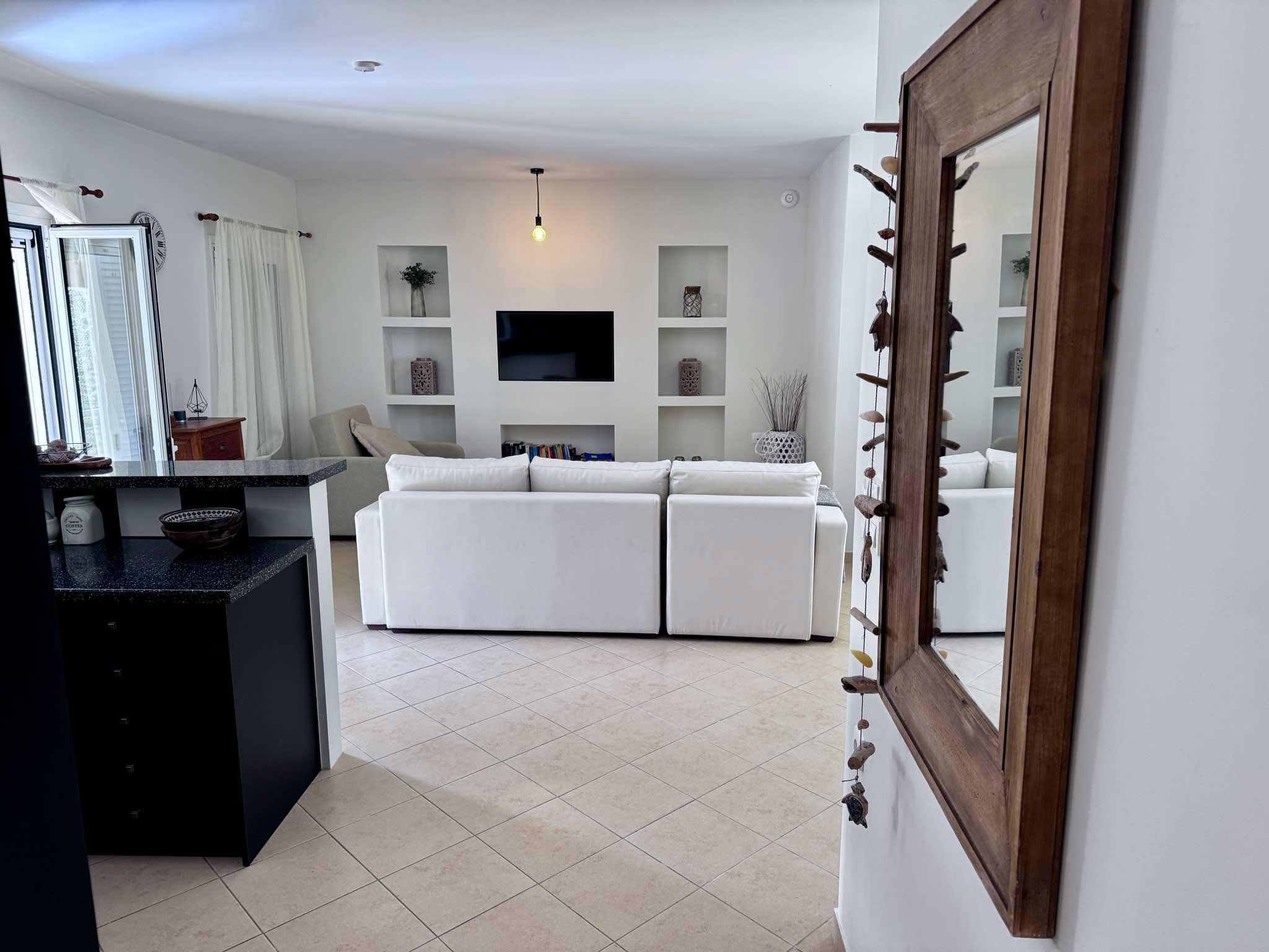 At the heart of the garden lies a brand-new swimming pool, framed by a spacious sun terrace where you can soak up the sun or unwind under the shade of the surrounding greenery. The villa itself is set on one level and welcomes you with an airy open-plan living room and kitchen, designed for easy, comfortable living