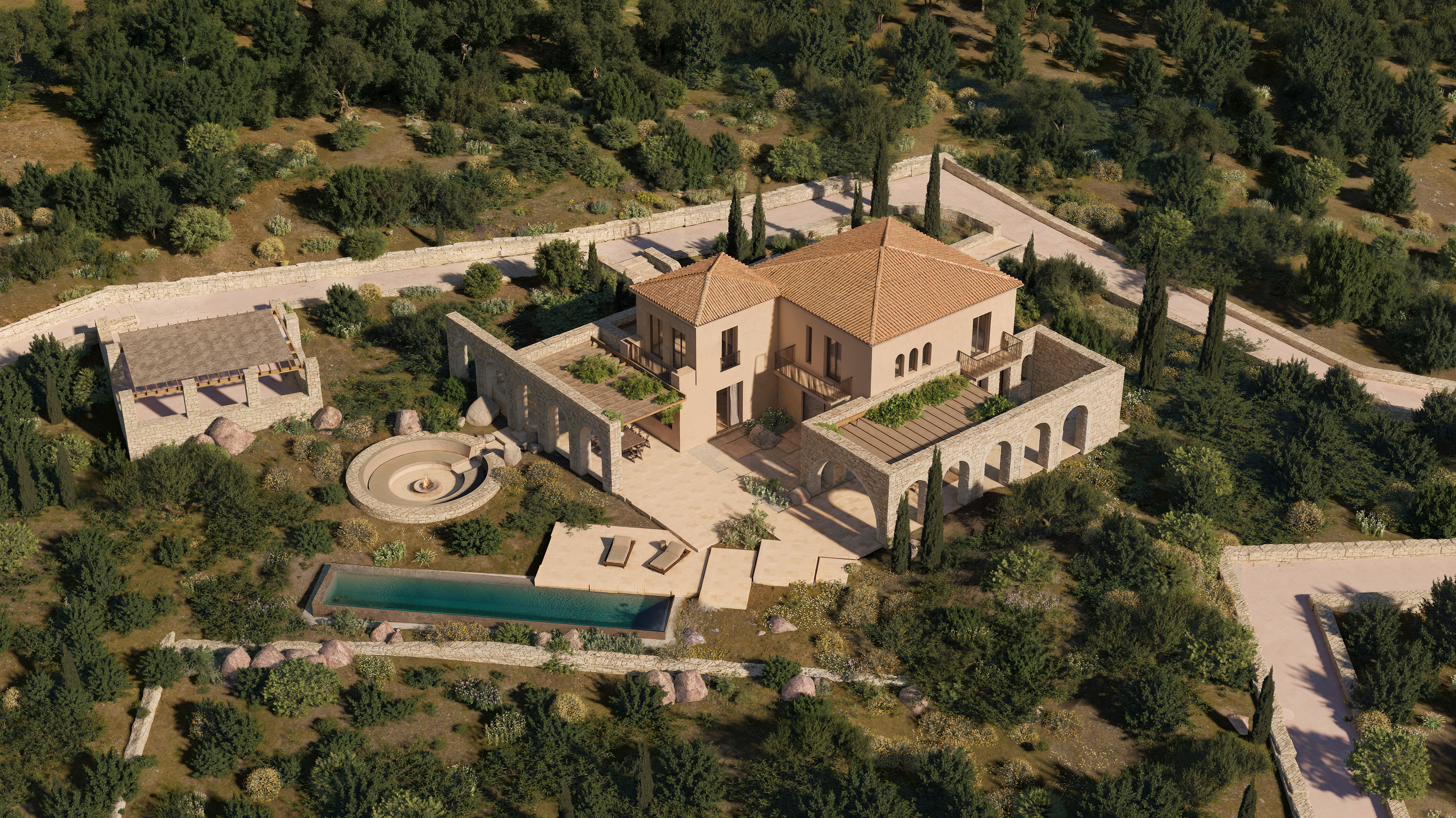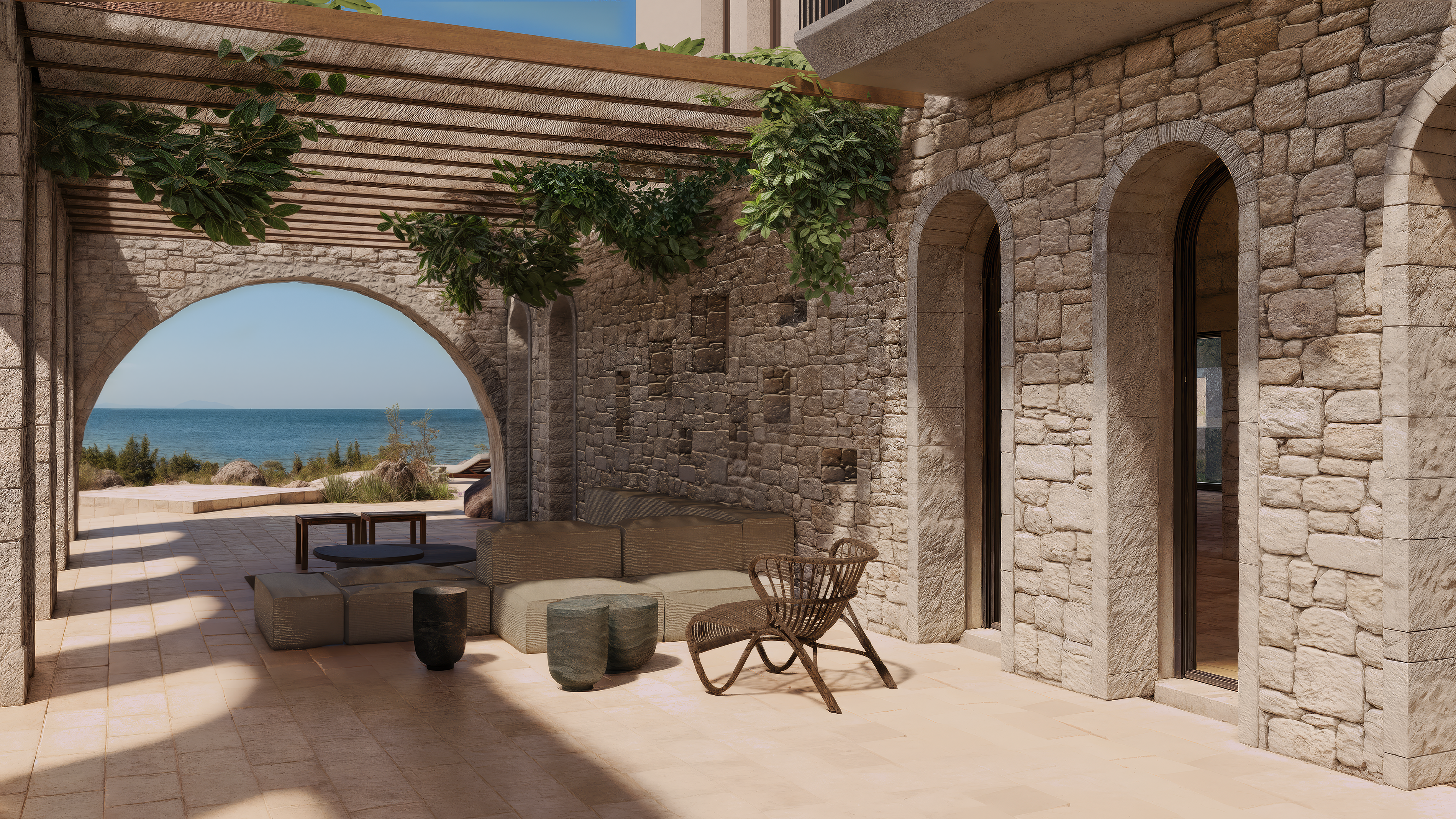 Outdoors, beautifully designed terraces extend toward a private swimming pool that gazes out over the endless blue of the Ionian Sea. Shaded pergolas frame elegant dining and lounge areas, perfect for long alfresco evenings beneath the stars. A fire pit invites intimate gatherings at sunset, while the basement wine cellar stands ready to complement every occasion. A private pathway gently leads down to the seafront, offering immediate access to crystalline waters.