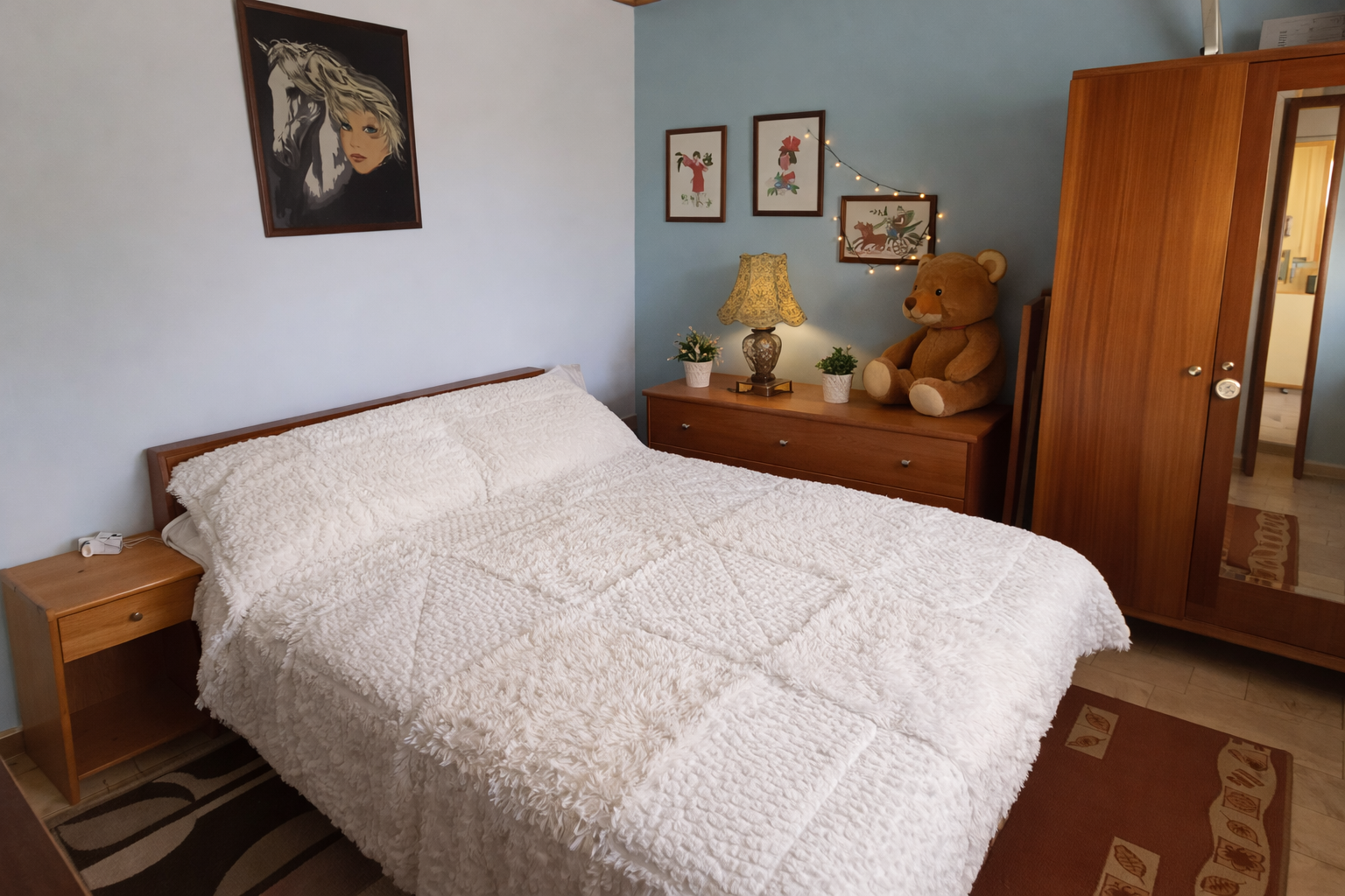 From the living area there is access to balconies that provide pleasant outdoor spaces where you can relax and enjoy the open countryside and mountain views. The elevated position of the apartment allows for plenty of natural light and a sense of openness.