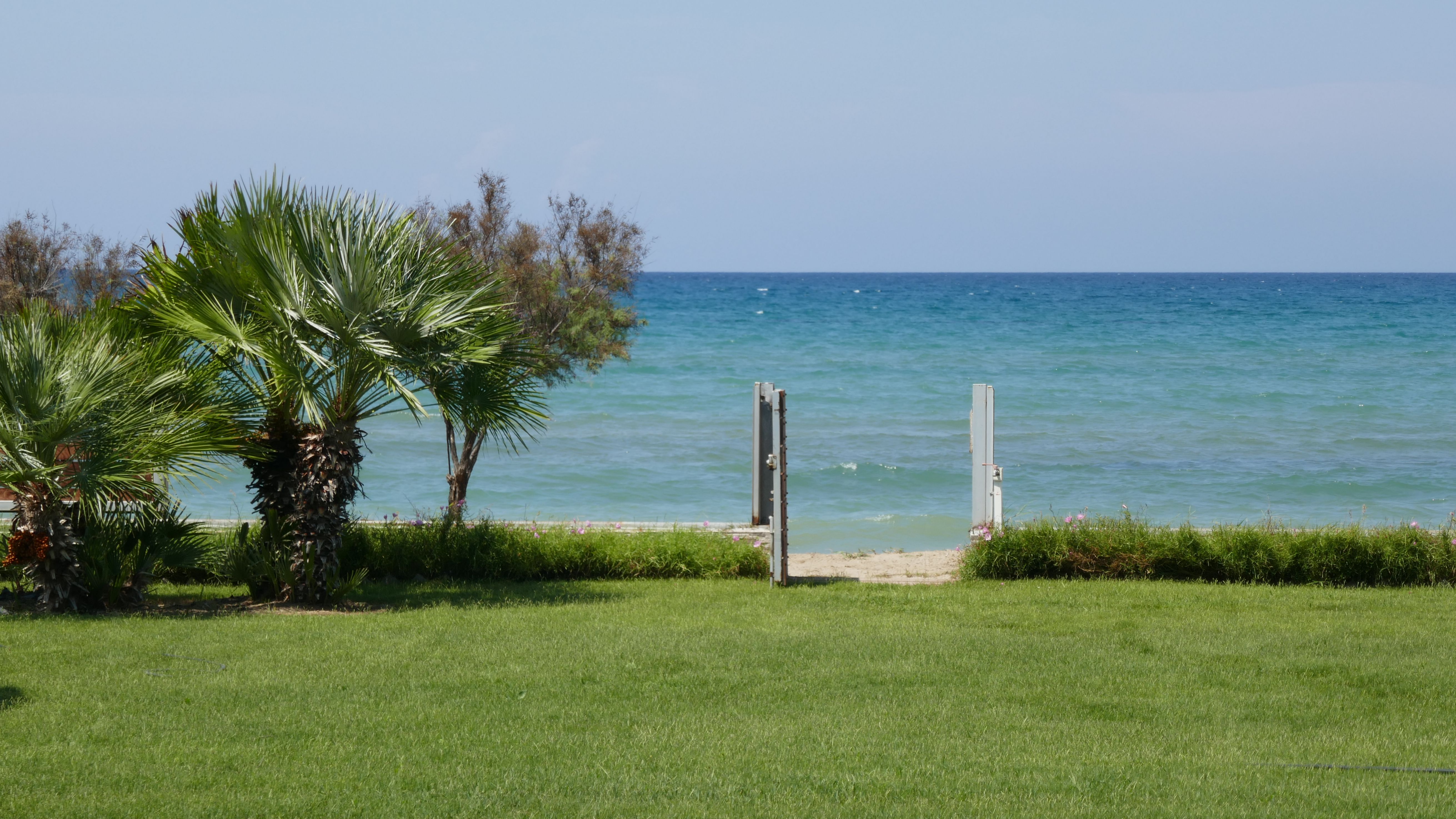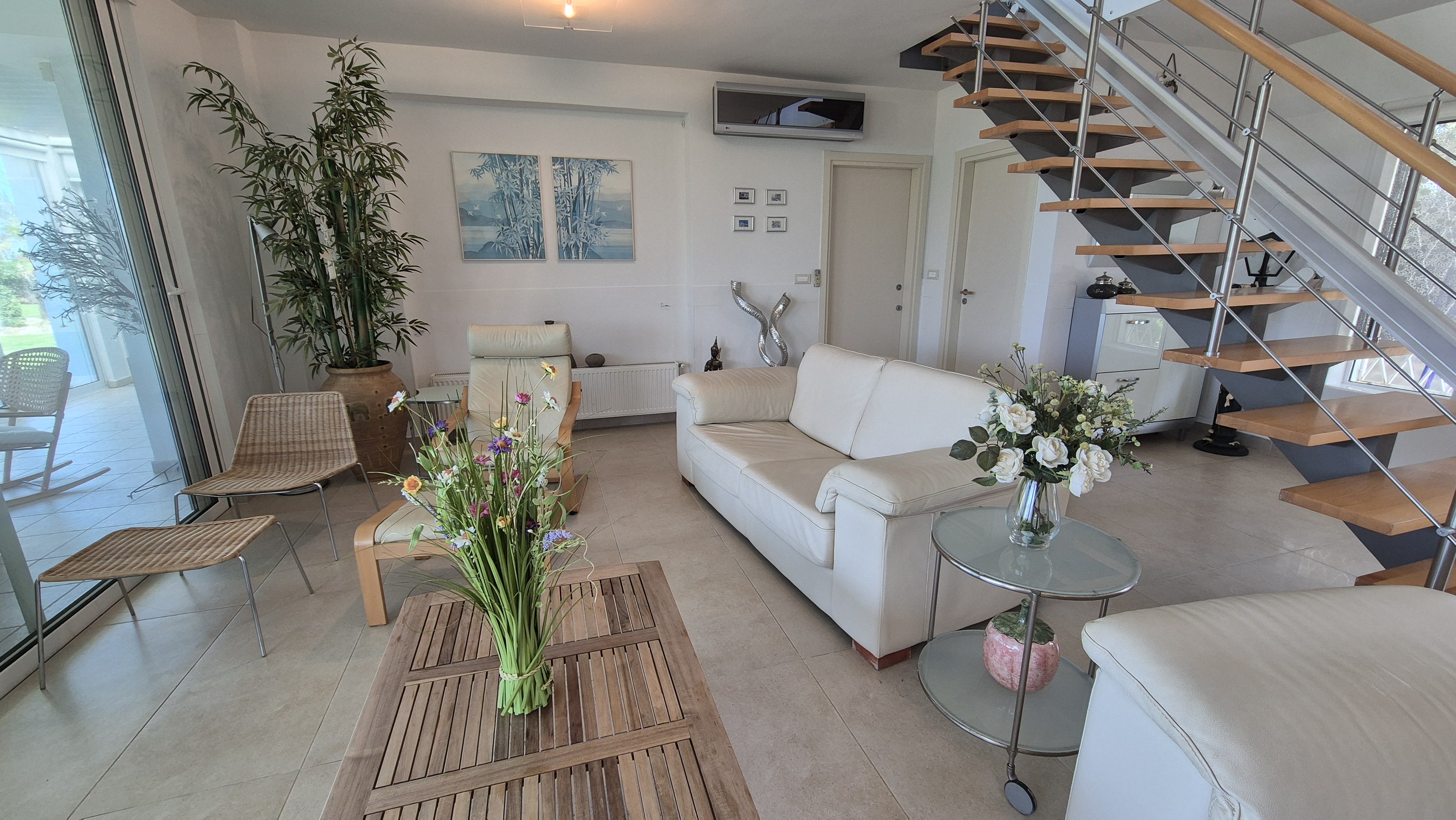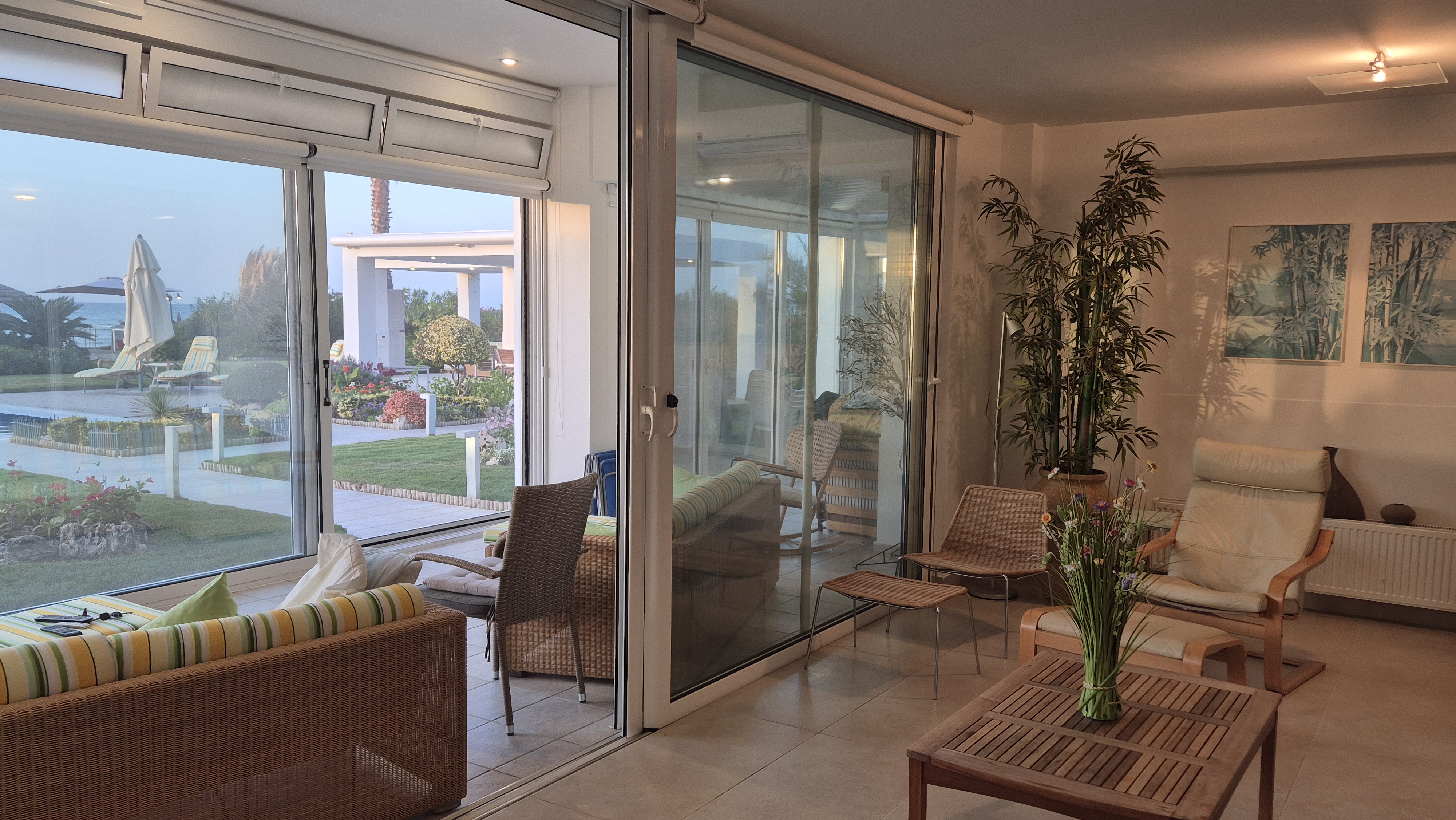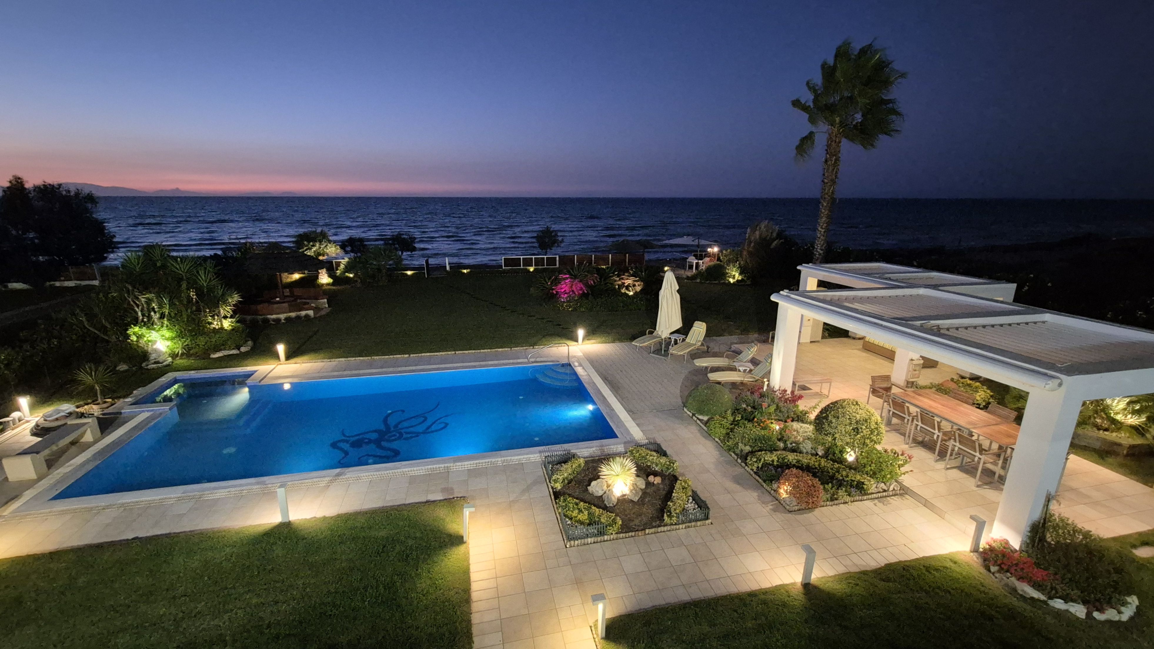 Expansive sliding glass doors connect the interiors with the landscaped garden, allowing abundant natural light and creating a seamless indoor and outdoor living experience. An infinity pool visually merges with the sandy beach and the Ionian Sea, while a private garden gate provides direct access to the shoreline. Panoramic sea views are a defining feature throughout the property.