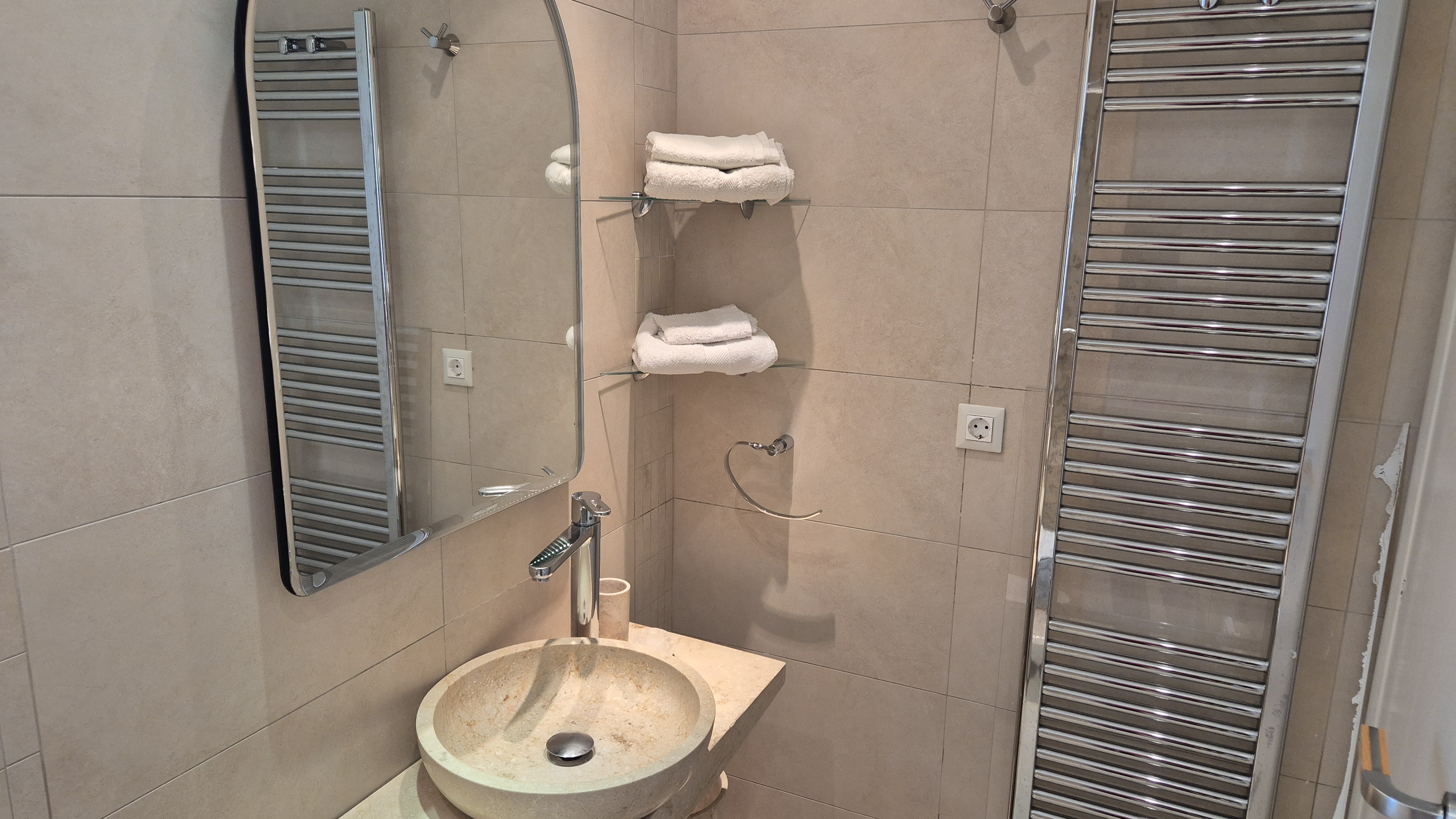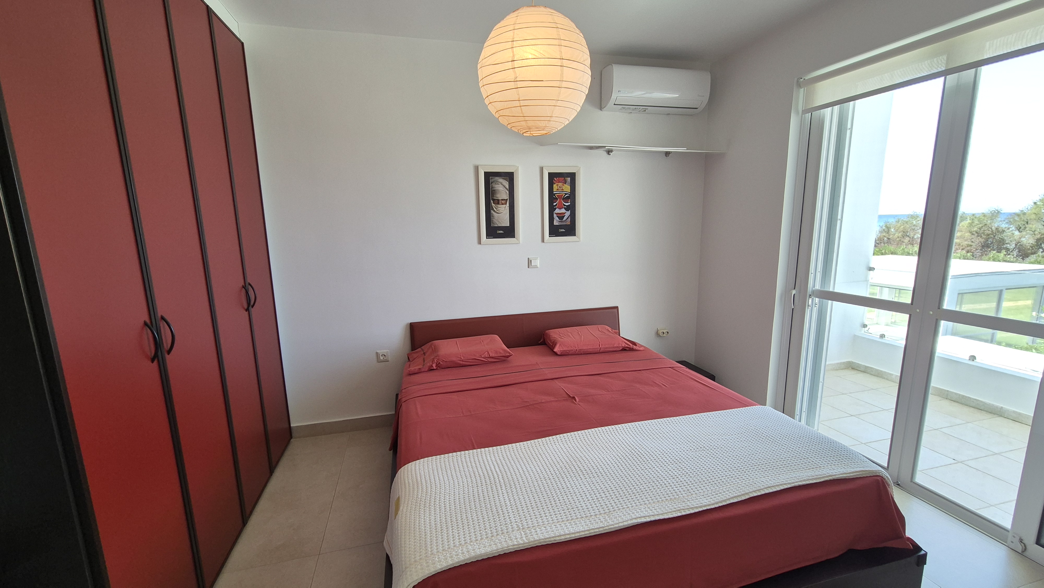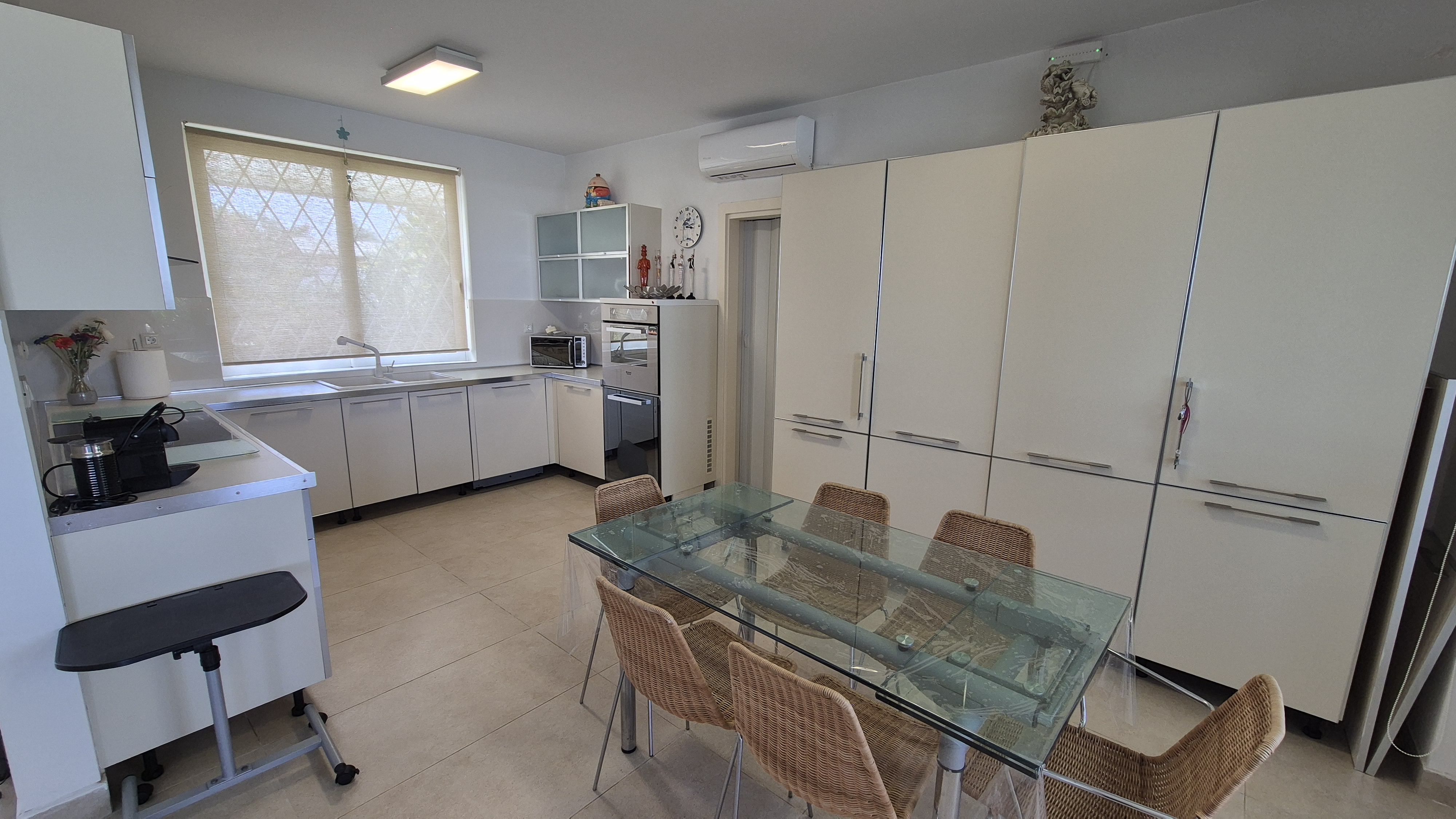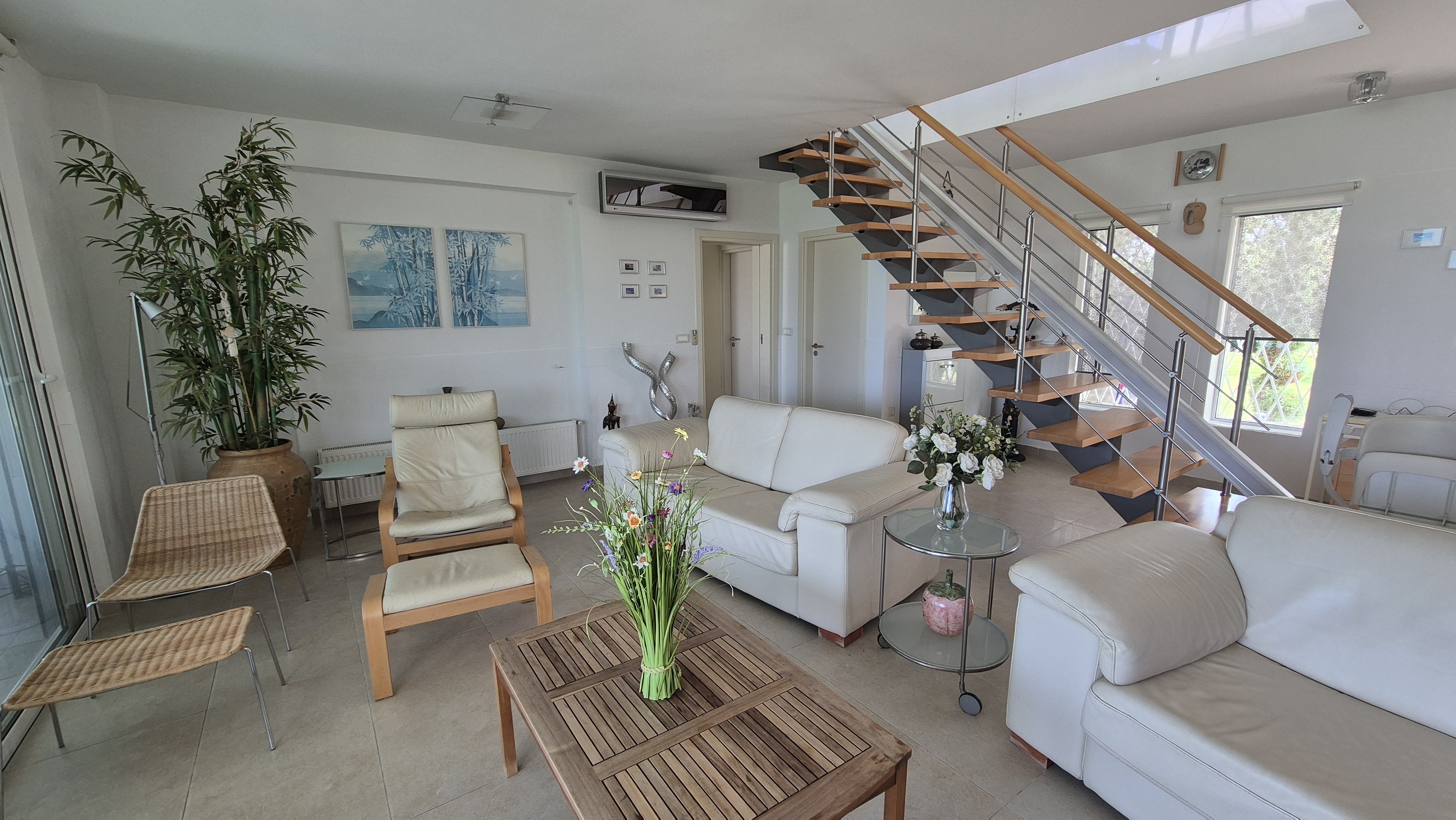 The villa accommodates up to eight guests with four bedrooms and three bathrooms. The ground floor features a spacious living area opening onto the pool terrace, a fully equipped open-plan kitchen with pantry, a guest WC, and a bedroom with en-suite bathroom. The upper floor offers a kitchenette, three bedrooms, and two bathrooms, one en suite, as well as a generous veranda with sweeping sea views. One bedroom can be adapted as an additional living space through sliding glass partitions.