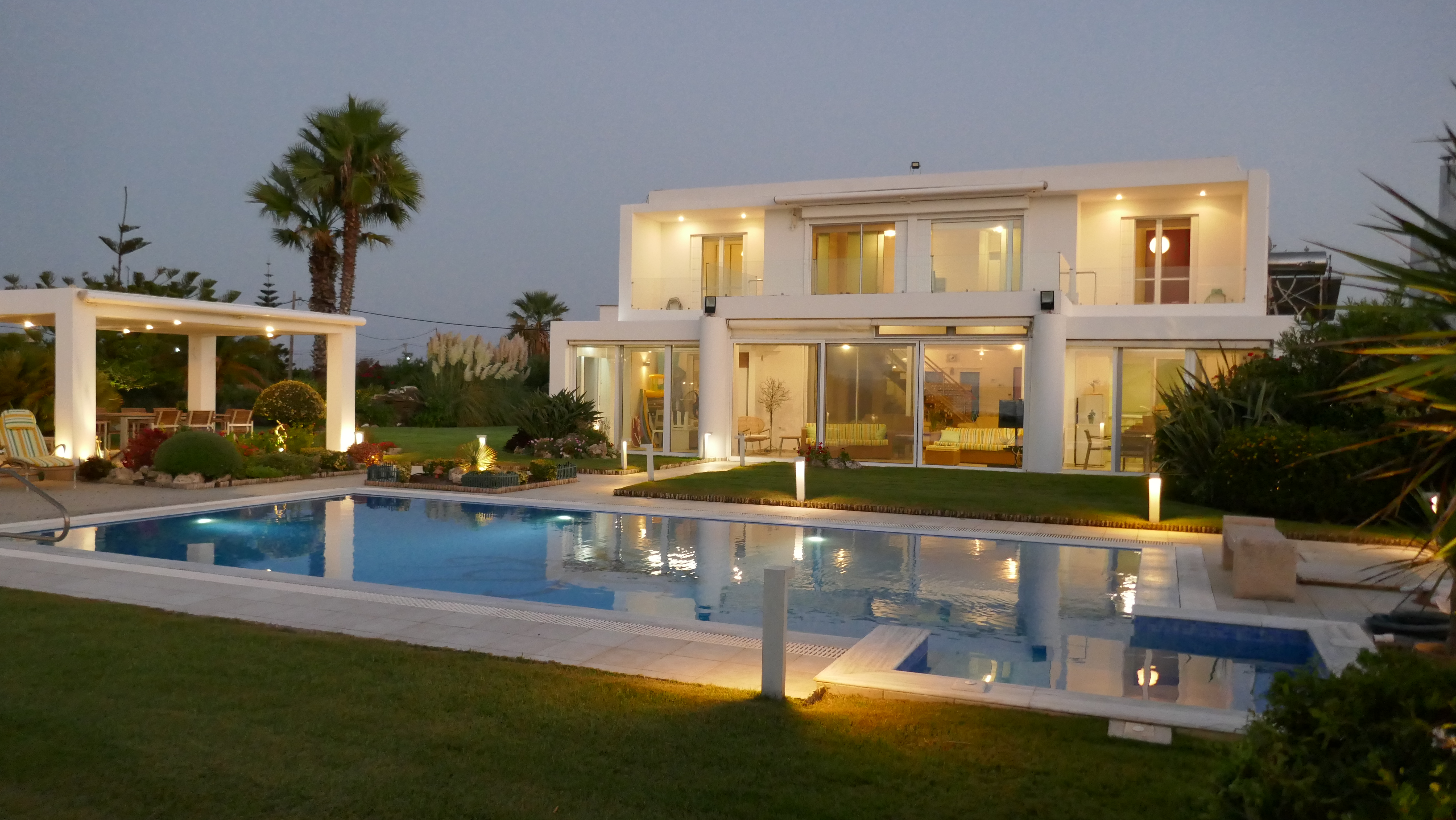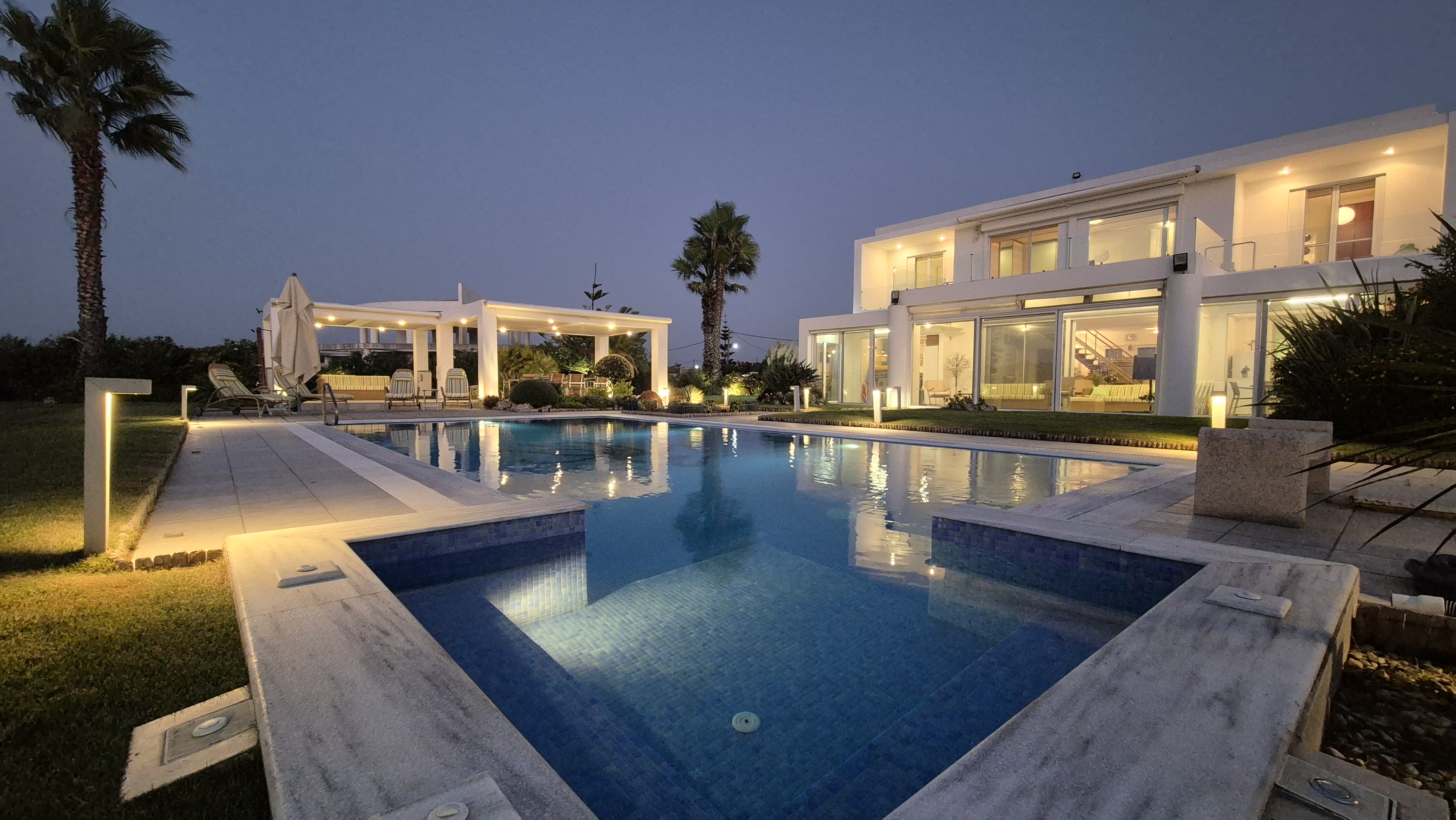 Set within a Mediterranean garden with extensive lawn areas, palm trees, and flowering bougainvillea, the outdoor spaces are designed for relaxation and privacy. Shaded seating areas, automated awnings, a pergola by the pool, and a large infinity pool with shallow massage zone complete this refined seaside retreat.