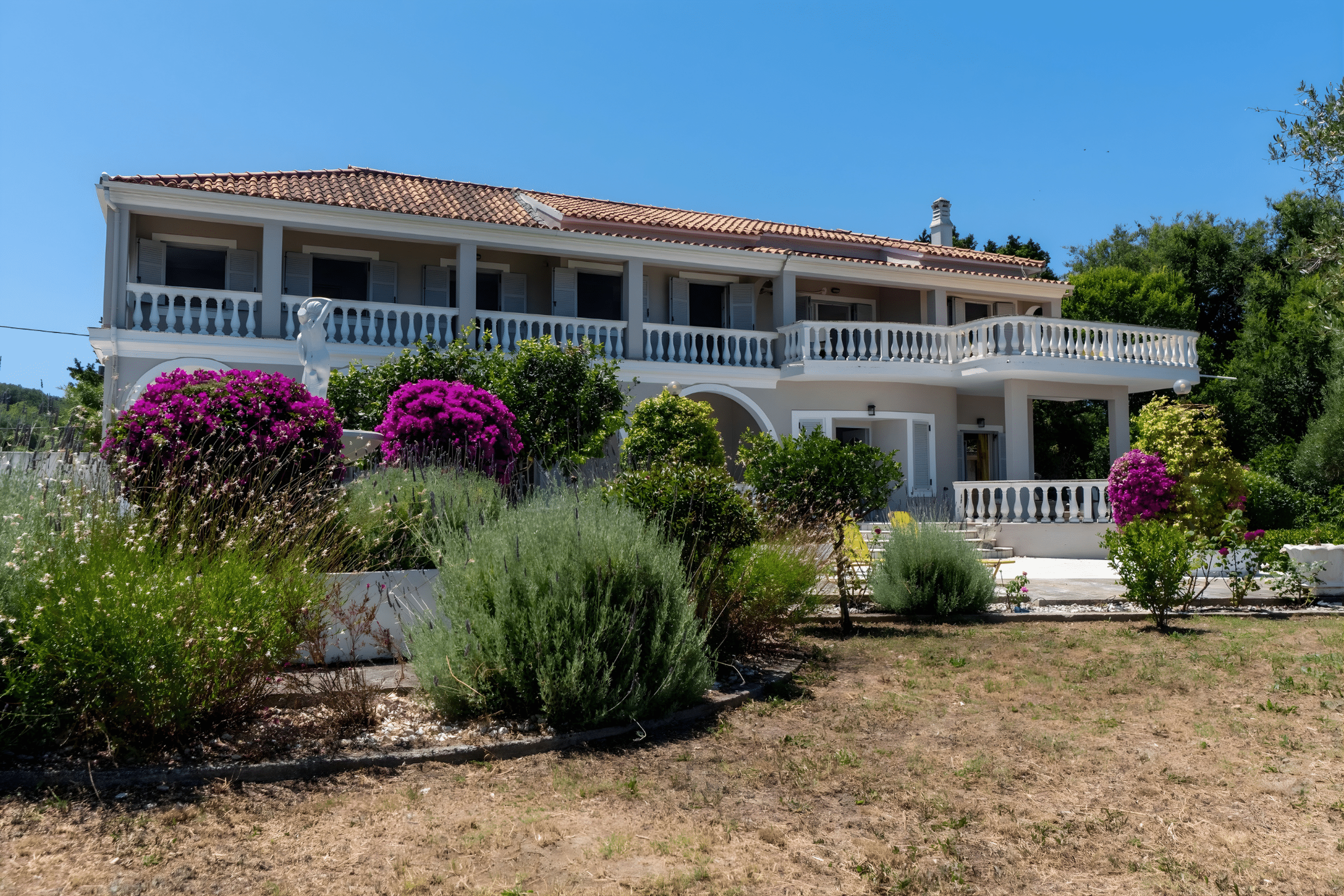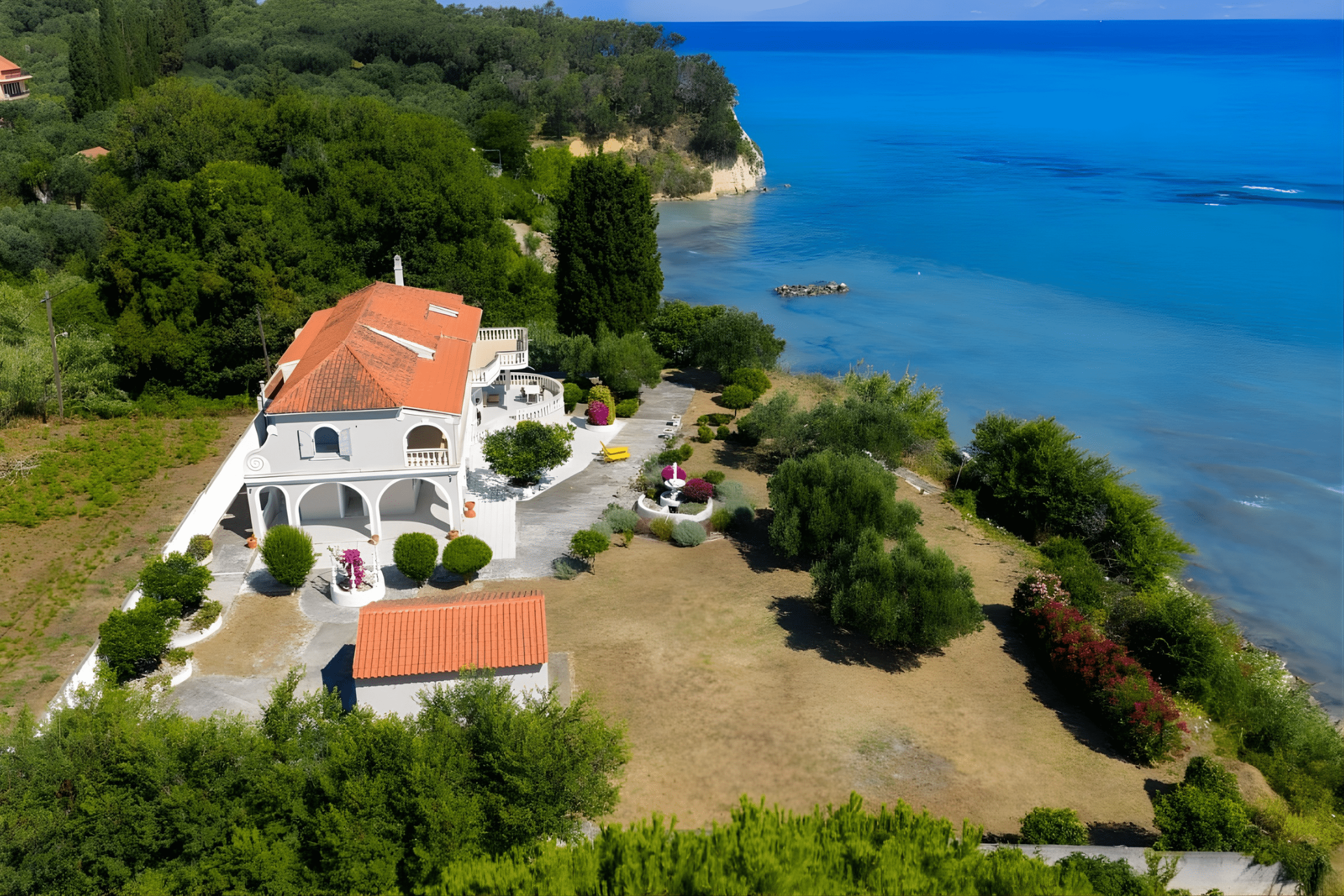 This magnificent property boasts absolute seclusion, featuring a private pathway leading directly to the crystalline waters, just a few steps from the lush, manicured gardens. Expansive balconies and generous terraces on both floors frame uninterrupted views of the vast Ionian Sea, a truly captivating setting to savor both the dawn and the twilight.